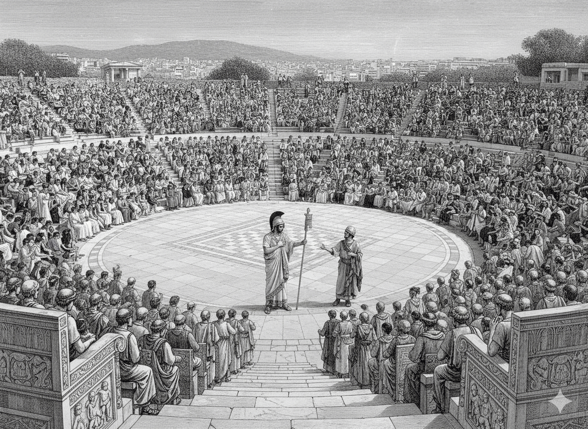 Представьте: 335 год до нашей эры. Афины. Мы на южном склоне Акрополя, в Театре Диониса. Каменные ступени, высеченные прямо в склоне холма, вмещают до 17 тысяч зрителей. Внизу, в круглой орхестре, разворачивается трагедия Софокла «Царь Эдип». Вы сидите на самом удобном месте — в первом ряду, на почётном кресле из пентелийского мрамора, и наблюдаете за происходящим на сцене.